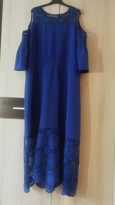 Suknia na wesele w kolorze jasnego granatu Stan idealny ,założona tylko raz Posada pięknie zdobiony koronką typu ...